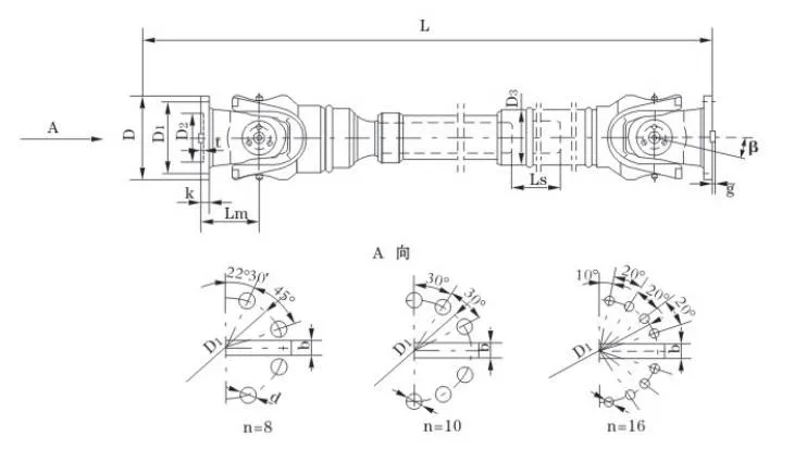 | št. | Premer vrtenja D mm | Nazivni navor Tn KN·m | Kot pregiba osi β (°) | Utrujeni navor Tf KN·m | Flex količina Ls mm | Velikost (mm) | Vrtilna vztrajnost kg.m2 | Teža (kg) | |||||||||||